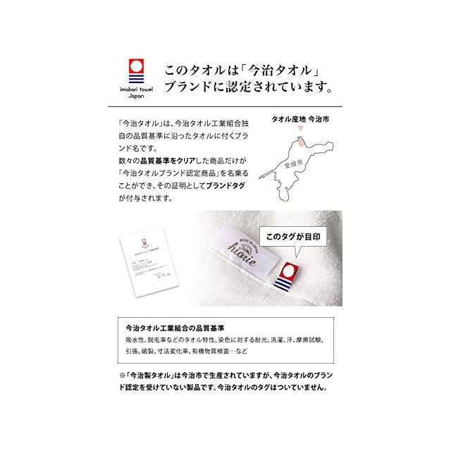 【高品質の証 今治タオル認定】日本を代表するタオル産地今治は、主にギフト向けの高級感のある厚手のタオルや、織り柄をあしらったタオルなどを得意とする産地です。この今治タオルブランドマークは、今治のメーカーをまとめる「今治タオル工業組合」独自の品質基準に合格した高品質のタオル商品であることをするものです。