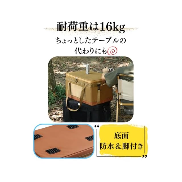 底面には防水加工と脚が付いており、地面の状態を気にせず使用可能です。蓋を閉めればちょっとしたテーブルの代わりにもなる万能デザインです。使用しないときは折り畳みコンテナとしてコンパクトに収納可能。持ち運びや保管時のスペースを取らず、とても実用的です。工具やアクセサリーを整理するツールバッグとしても最適で、あらゆるアウトドアシーンで活躍します。