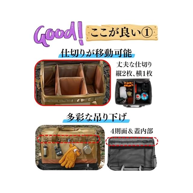 容量は大容量60Lで、「こんなに入るの?」と驚くほどの収納力。さらに、内部には仕切りが移動可能なシステムを採用し、付属の丈夫な仕切り(縦2枚、横1枚)を使って自由にカスタマイズ可能。荷物を整然と整理できます。耐荷重は驚異の16kgを実現し、重い道具やギアも安心して収納可能です。外側には多彩な吊り下げ機能があり、小物を簡単に取り出せる工夫が施されています。蓋裏にはメッシュジップポケットが付いており、細かいアイテムを見つけやすく、散乱防止バンドが中身のズレを防ぎます。