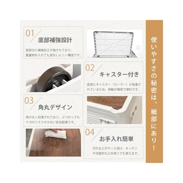 【※取っ手付き・キャスター付き】両側に取っ手、底にキャスターが設置されているため、持ち運びや移動が楽になります。これにより、お部屋の模様替えや季節ごとの収納物の入れ替えが手軽に行えます。【※積み重ねる・折りたたみ】使用しない際には簡単に折り畳んで収納でき、狭いスペースに保管できるため、空間を有効に節約できます。また、コンパクトで軽量な設計により、保管や持ち運びが非常に簡単です。特に引越や旅行の際には大変便利です。垂直方向の空間を最大限に活用できるため、特に限られたスペースを持つ環境、たとえば小さな間取りや寮などにおいて、収納容量を効果的に増やすことができます。