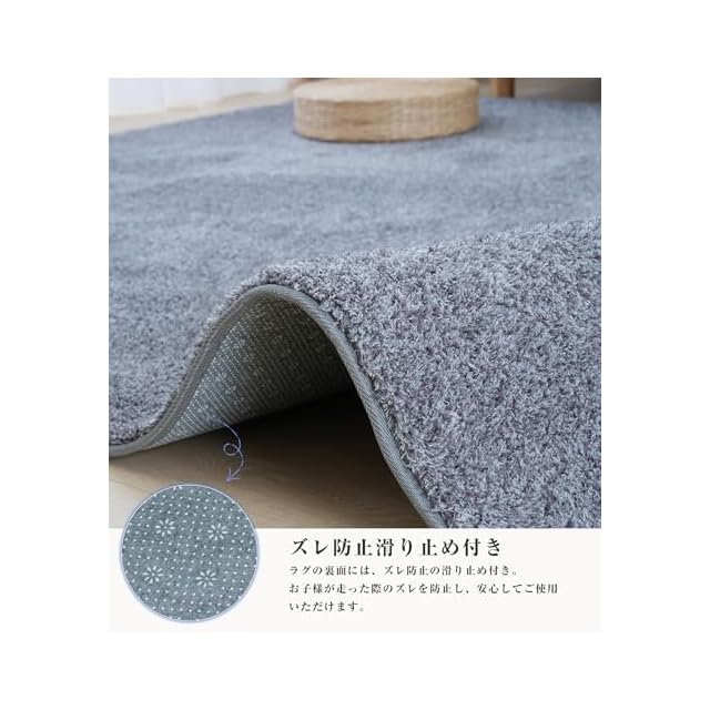 【ラグカーペット仕様】サイズ:約185×185cm (約2畳)①表地:毛足の長さ約14mm ②中材:ウレタンフォーム約12mm ③裏地:不織布(滑り止めドット付き)【オールシーズンカーペット】このラグの毛足は、踏み心地は柔らかく、夏は冷房機器との併用で快適に過ごせます。冬はホットカーペットや床暖房の上に敷いてご使用いただけます。フワフワと暖かく、居心地が格段に向上します。【快適で清潔にお使い】日常的に掃除機でお掃除することをオススメ致します。また、絞った濡れ雑巾での拭き上げも、簡単に清潔な状態を保てます。汚れが目立つ場合には、薄めた中性洗剤での手洗いすることで、汚れをしっかり落とせます。
