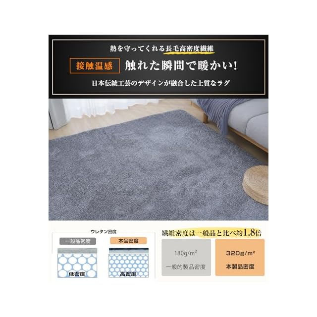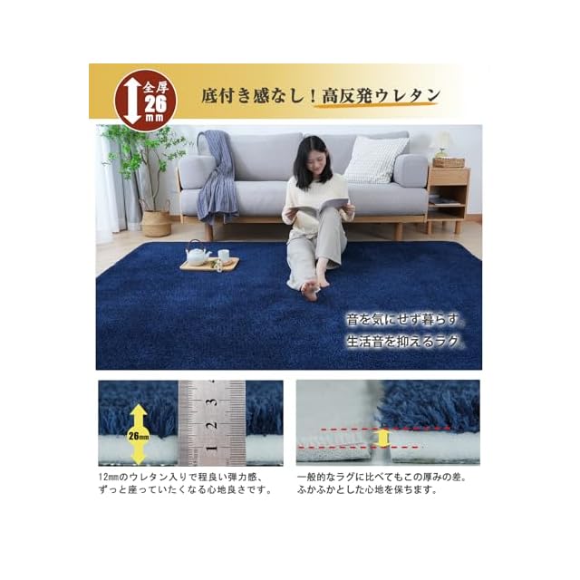 【毛足とウレタンの絶妙なバランス】 この厚手カーペットの快適さの秘訣は、毛足が約14mmと硬めウレタンとの組み合わせにございます。12mm厚のウレタンを使用しているため、クッション性があり、底付き感が少なく、防音・遮音も期待できます。シャギーラグの14mmの毛足は、長すぎても短すぎてもない理想的な寸法です。長すぎる毛足は日常使用で絡まりやすいという問題がありますが、14mmの設計は、絡まりや毛玉の発生を大幅に減少させ、柔らかさを保ちながらふわふわな踏み心地を実現しております。 14mmの毛足と相まって最適なのが12mmのウレタンです。適度な厚みが足を包み込み、体重を均一に分散し、底付き感を効果的に抑えます。足を厚手ラグに踏み入れると瞬時に柔らかく沈み込み、足を上げると即座に元の形状に回復する優れた反発性が特徴です。 日常の使用シーンでは、毛足が表面の柔らかさを、ウレタン層が深部の支えをご提供いたします。朝足を踏み入れる瞬間から、夜のくつろぎ時間まで、どのシーンでも快適な居心地をご提供し続けます。