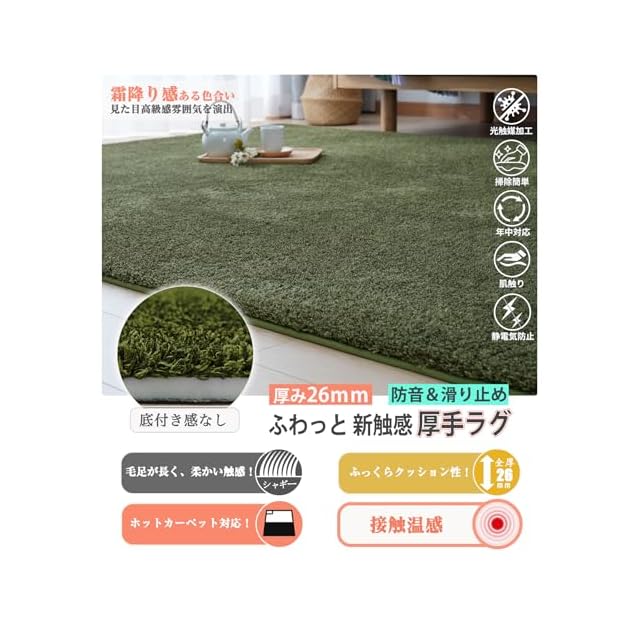【ラグカーペット仕様】サイズ:約135×185cm (約1.5畳)①表地:毛足の長さ約14mm ②中材:ウレタンフォーム約12mm ③裏地:不織布(滑り止めドット付き)【オールシーズンカーペット】このラグの毛足は、踏み心地は柔らかく、夏は冷房機器との併用で快適に過ごせます。冬はホットカーペットや床暖房の上に敷いてご使用いただけます。フワフワと暖かく、居心地が格段に向上します。【快適で清潔にお使い】日常的に掃除機でお掃除することをオススメ致します。また、絞った濡れ雑巾での拭き上げも、簡単に清潔な状態を保てます。汚れが目立つ場合には、薄めた中性洗剤での手洗いすることで、汚れをしっかり落とせます。