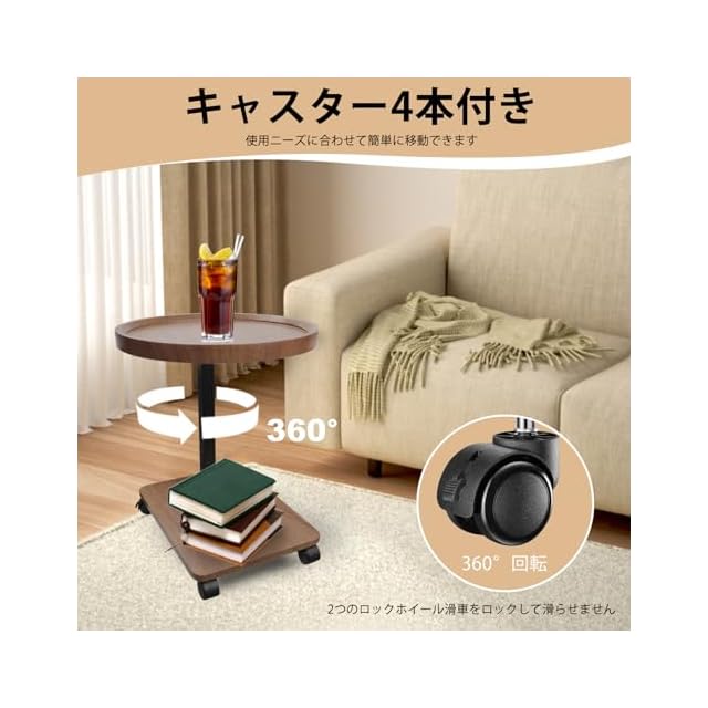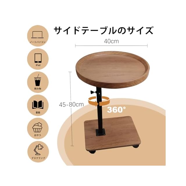 【移動に便利サイドテーブル】組み立て後の丸型サイズ(cm):幅40×奥行き40×高さ45~85cm(キャスター付き);本体質量約4.2kg;このミニテーブルの底部には4つのキャスターが付いており、簡単に移動させることができます。360度回転できる4つのキャスター(2個はストッパー機能)は絨毯の上でも気軽に引き寄せます。昼はソファでPC作業、夜はベッドサイドに本や飲み物を置くなど兼用することができます。動かすのが簡単で、テーブル下の掃除をしやすいのもうれしいポイントです。