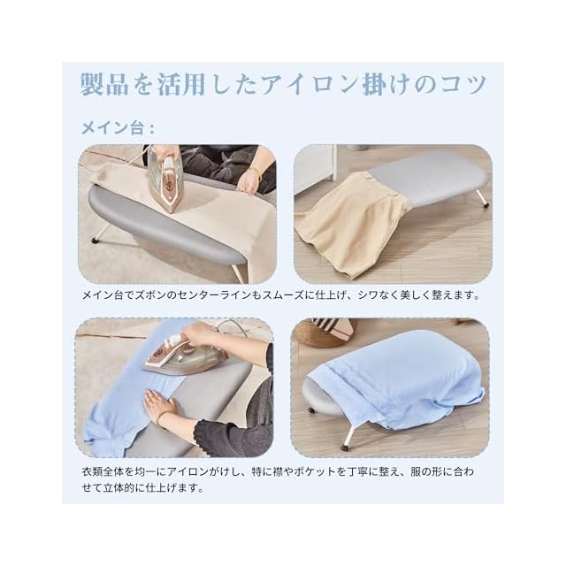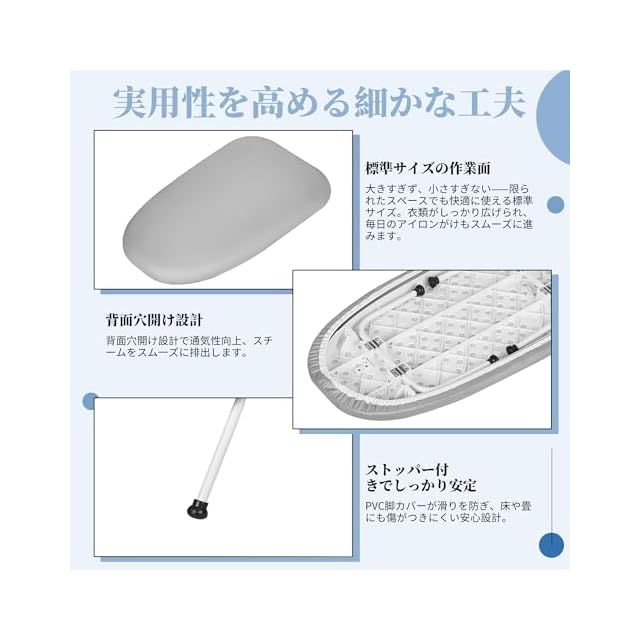 【広い台面&高耐熱】:広いアイロン台と耐熱性の高い通気構造により、大きなシャツやシーツも効率よくアイロンがけでき、蒸気をしっかり通して水滴が溜まりにくい快適な使用感を実現します。