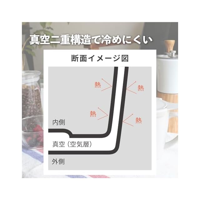 真空断熱構造なので美味しい温度を長時間キープ。 また、冷たい飲み物を入れても結露しにくい。