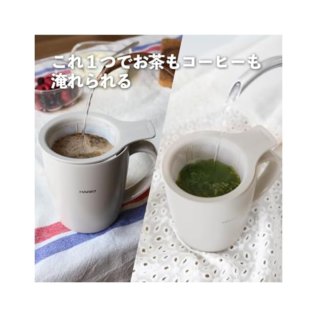 マグ1つでお茶もコーヒーも。 ストレーナーに茶葉/コーヒー粉を入れてお湯を注いでフタをして待つだけ。 簡単に1人分が淹れられます。
