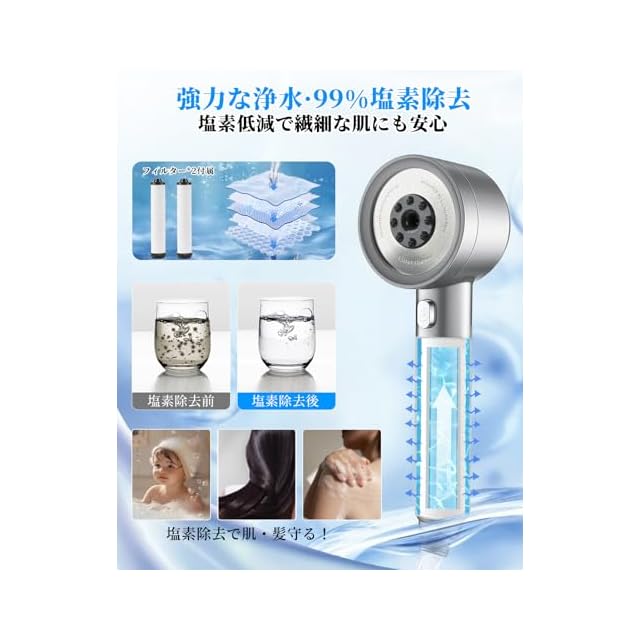 【塩素除去フィルター搭載★肌に優しいシャワーヘッド】健康な肌と髪を保つためには、シャワー水のクオリティも重要です。内蔵フィルターが水道水の残留塩素や不純物を効果的にカット。塩素による肌や髪へのダメージを軽減し、乾燥やかゆみの悩みから解放します。肌なじみの良い均一な水流で、心地よいシャワータイムを実現。家族みんなで使える、健やかで美しい肌を育むシャワーヘッドです。