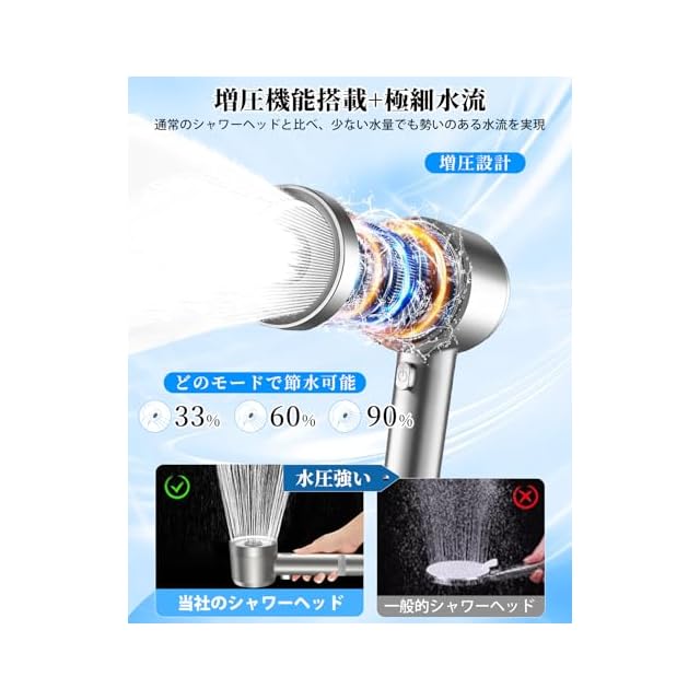 【最大節水90%★手元止水機能】革新的な節水技術を搭載し、従来品のシャワーヘッドにより数多くの穴の目が細かく、極細穴で少量の水でも勢いのある水流に供給し、最大約90%の節水率を実現した、空気力学を活用した独自設計で水圧を強化。高層階や低水圧環境でも安定した水流を提供し、増圧効果にも抜群、快適な使用感を実現!ワンタッチで簡単に水を止められる便利なシャワーヘッド。片手操作可能だから、シャンプー中も蛇口まで手を伸ばす必要がなく、使い勝手抜群。