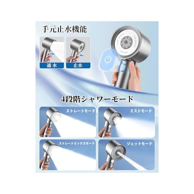 【4段階モード★洗浄力抜群】4種類の出水モードを搭載しておるシャワーヘッド マイクロナノバブルは、シャワータイムをまるでSPAのような特別な体験に変えます。やさしいミストモードは、お肌に刺激を与えずに洗顔可能。ストレートモードはリラックスしたバスタイムに最適です。ストレートミックスモードは適度な洗浄力で汚れをしっかり落とし、ジェットモードなら全身を爽快に洗い流せるだけでなく、トイレ掃除までこなします。水流モードを使い分けることで、より効果的で快適なシャワーの時間を楽しめますよ。