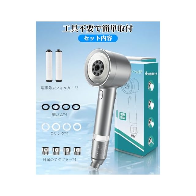 【パッキング内容】パッキング内容には、シャワーヘッド本体、アダプター*4、網ゴム*4、Oリング*4、塩素除去フィルター*2、日本語取扱説明書*1