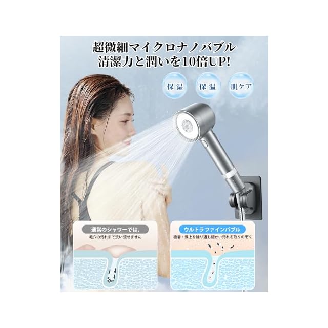 【革新的マイクロナノバブル】斬新なマイクロナノバブルテクニカルを採用し、超微細泡を生成し、水の粒子を極限まで小さくして泡に変えることで、肌や髪に泡が入り込み、しっかりと優しく馴染み、汚れを洗い流せます。汚れをしっかり落としながら、肌の潤いと体温を保つ効果も期待できますので、入浴後も体が潤って暖かいです。日々のシャワーがより快適で贅沢な時間に変わります。