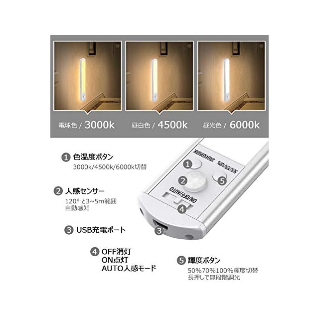 【3つのモードで幅広い用途に対応】AUTO(モーションセンサーモード)、ON(常時点灯モード)、OFF(電源オフモード)から選択可能。ワイヤレスLEDライトなので、クローゼット、洗面所、ナイトライト、廊下、キャビネットなどに最適です!