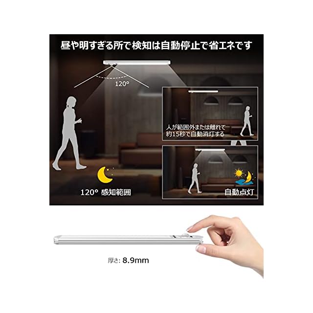 【120°モーションセンサー&自動オフ】AMERTEER LEDバーライトは、120°の範囲内、9.8~16.4フィート(3~5m)以内の動きを検知し、自動で点灯します。動きがない状態が15秒続くと自動で消灯します。省エネ設計のため、クローゼット、階段、キッチン、洗面所に最適です。