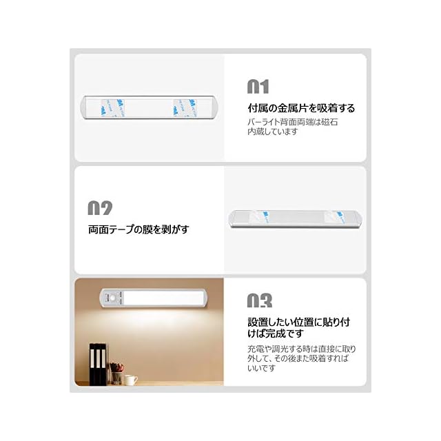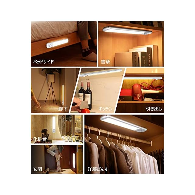 AMERTEER モーションセンサー LED バーライト、USB 充電式 クローゼット LED 読書灯、マグネット式、キャビネットライト、明るさ調整機能付き、洗面所・キッチン・階段に最適.