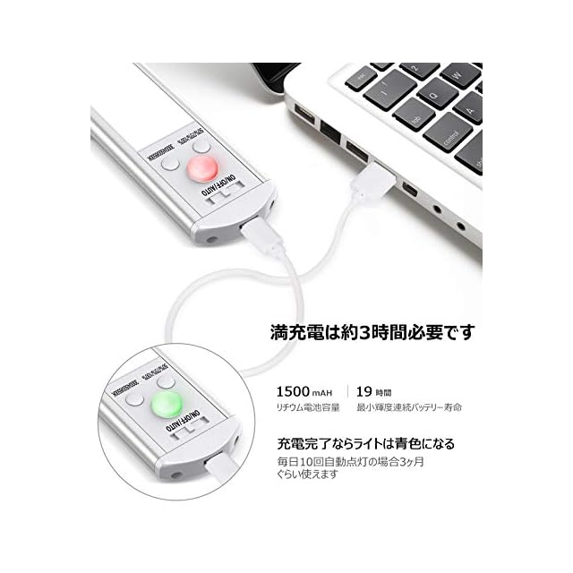 【充電式&長持ちバッテリー】内蔵バッテリーは約5時間でフル充電され、1日30回の点灯で最大5か月使用可能です。USB充電式のため配線不要で、どこでも手軽に設置できるコードレス照明を実現。充電インジケーター付きでバッテリー残量も確認できます。