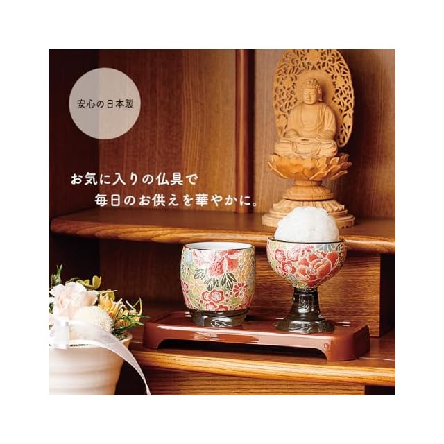 花立(お仏壇用花瓶)、灯立(ろうそく立て、燭台)、香炉(線香立て)の三具足とも一緒に使用しやすい、ミニサイズの仏具です。仏器(湯呑み)との併用も可能です。