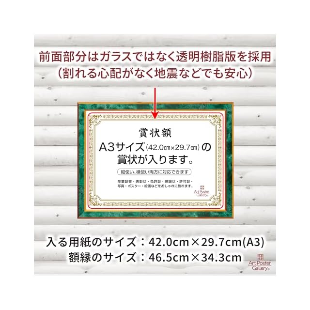【特徴2】前面はガラスではなく透明樹脂板を採用しております。万が一地震などで額縁が落ちた時でも比較的安心です。