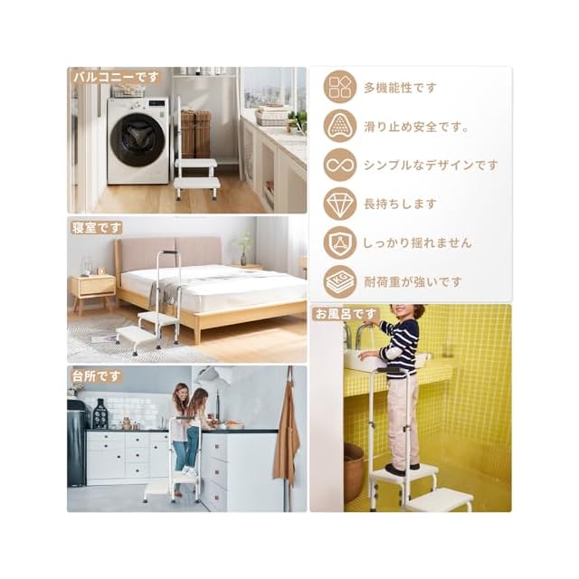 大切なご家族のための安心設計:手すり付きなので、ご高齢の方やも安心して昇降できます。 段差のある浴槽周り、キッチンでのちょっとした段差など、ご自宅のさまざまな場所で安全をサポートします。 特に、足腰が弱ってくると段差が大きな負担になりがちです。 この手すり付き踏み台を使えば、大切なご家族の移動をサポートし、転倒などのリスクを軽減できます。