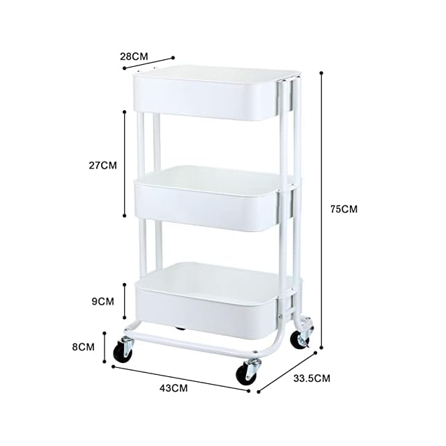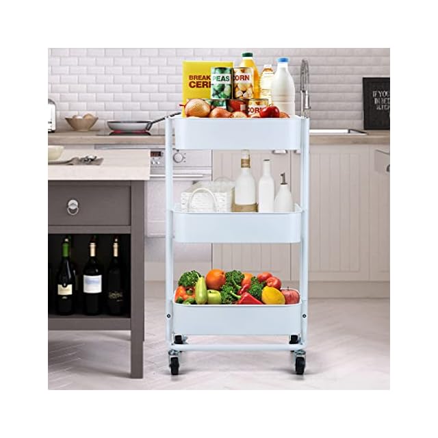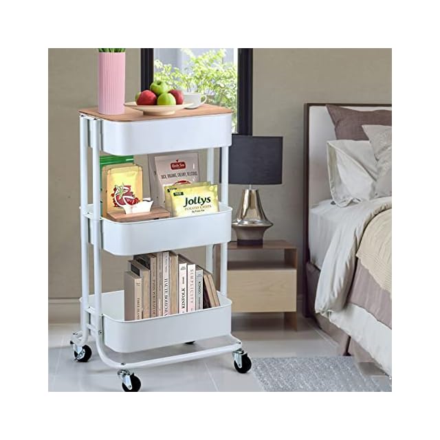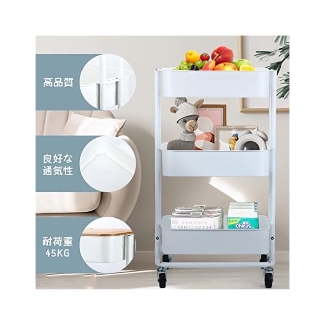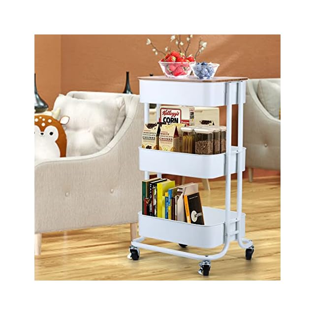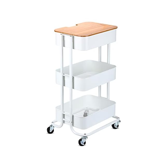HANKEY キッチンワゴン 天板付き 収納ワゴン ベビーワゴン 台所収納 収納カート バスケットラック 整理棚 キャスター付き 移動式 3段 組立簡単 スチール製 全体耐重45KG 幅43x奥行33.5x高さ75cm… (盖板, 白色) | つむぎ屋