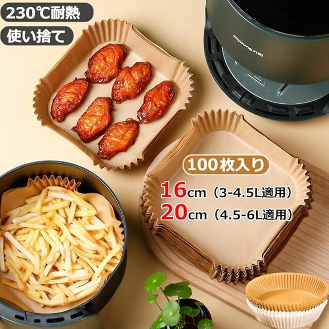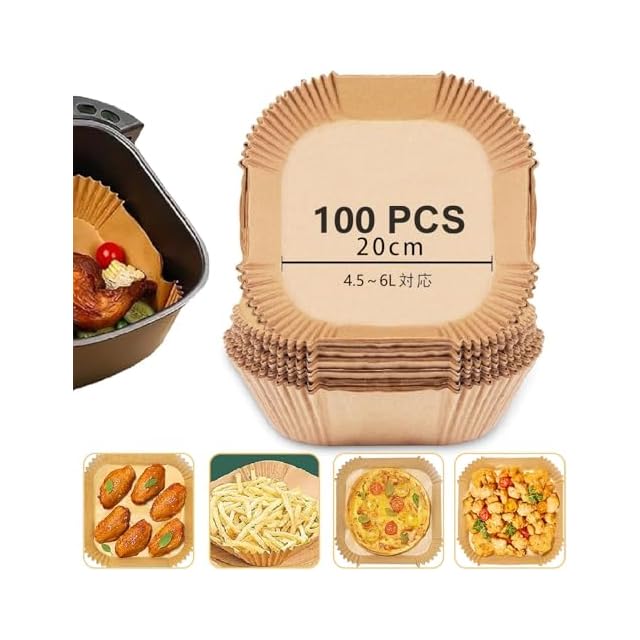 エアフライヤー用紙 100枚セット 内径20cm 四角形 ノンフライヤー 使い捨て紙 天ぷら敷紙 油紙 スクエア型 クッキングシート シリコーンオイル紙 耐熱/耐油/耐水性 对应 烹饪垫 電子レンジ 4.5~6L適用 電子レンジ/オーブン/蒸し器 対応エアフライヤー 230℃耐熱 (内径20cm 100枚) | つむぎ屋