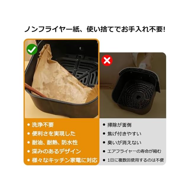 【使い捨てでお手入れ不要】弊社のエアフライヤー調理用紙は、敷いて終わったら捨てるだけで、ノンフライヤーのバスケットを汚さずに調理できます。調理後、毎回洗う手間が省けて、水も洗剤も節約できます。