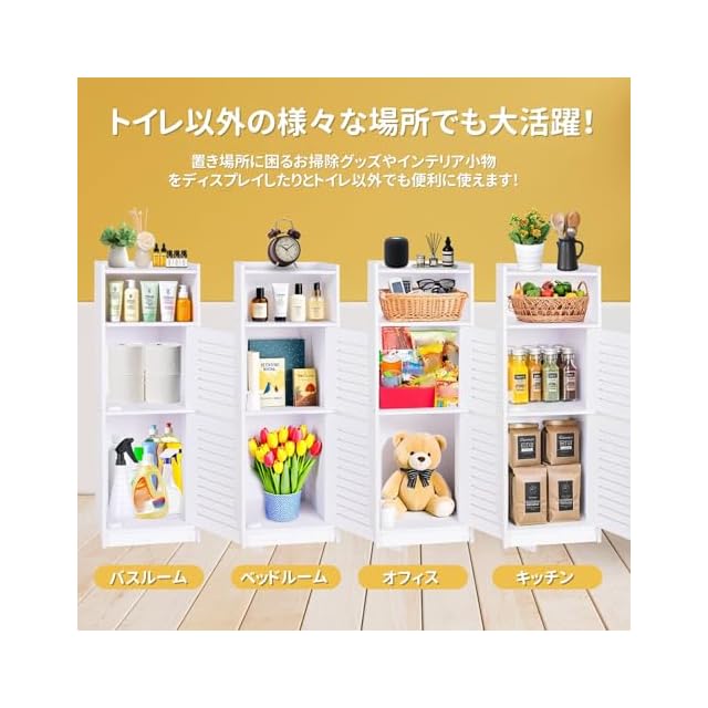 【優しい素材・機能で長く使用できる】優しいPVC素材を加工したものであり、木製より軽くで耐久性が強いだけでなく、トイレの湿気や水しぶきにも強く、カビができにくく、長期間清潔に使用できます。掃除アイテムからトイレットペーパーに生理用品、大きさや用途の異なるアイテムもスッキリ収納。クリーナーシートや生理用品は上段の棚へ、下段にはトイレットペーパーをたっぷり!