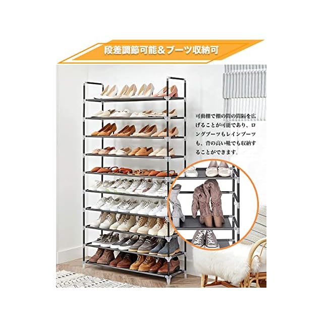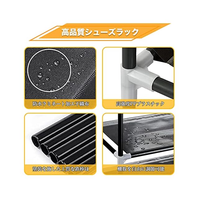【高品質シューズラック】 1.太い鉄パイプ- 直径13mmの鉄パイプはプラスチックをコーティングした、防錆、優れた耐荷重、長く使っても変形しにくい。2.防水層付き不織布- 丈夫な高級コーティング不織布の表面に防水コーティングを施しているので、水滴と埃を布巾で拭き取れやすい。3.耐摩耗ジョイント- 高強度環境配慮型PPプラスチック材料で作られ、パイプをしっかり支えます。