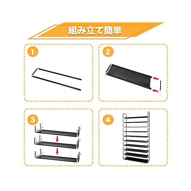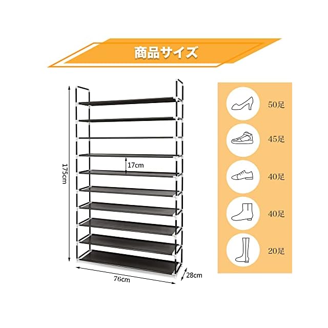 【大容量シューズラック】】この靴ラックは、全10段で、靴を38〜40足収納できます。収納スペースが狭く、靴が多い方に、この靴ラックは非常に好適です。「サイズ:76㎝*28㎝*175㎝」Diy自由自在に組み立て、棚板を1枚取り付けなければ、靴を入れることができます。シューズラックの高さを自由に調整できるので、靴の数によって5層、6層、8層、9層、10層までお好みによって自由に組み合わせることができます。お好みに応じて自由に組み立てられます。