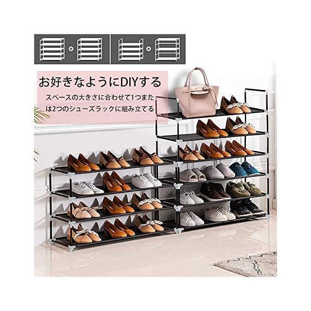 【シューズラック 組み立て簡単、分解容易】2段ずつで分割しての5段ラックで使用できます。日本語の取扱説明書が付属され、女性の方でも一人で楽に組み立てることができます。パイプを連結パーツで繋げて、カバーがラックに覆うだけ!輸送中の部品の破損トラブルが起こることを配慮し、部品をたっぷり同梱しますので、安心してご購入ください。