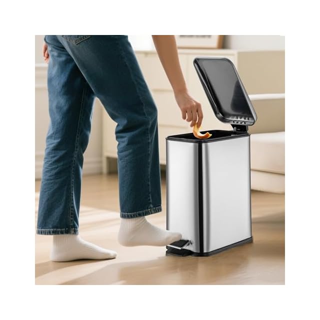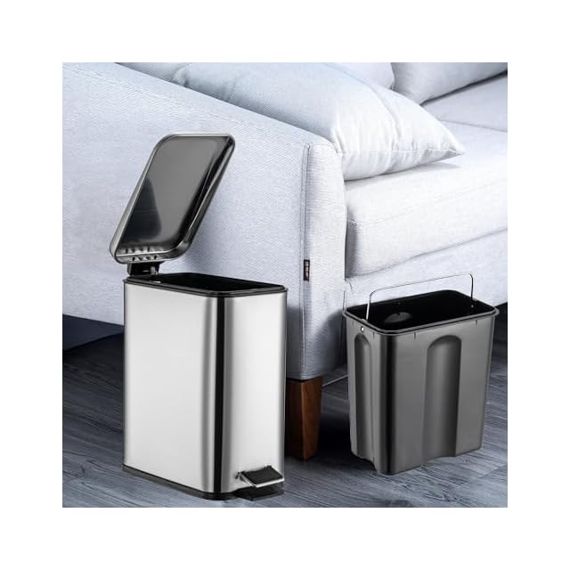 「銀色のステンレス製5Lゴミ箱」シルバー色のステンレス制ゴミ箱は本当に品格が高くて良い品質が見えます。縦開ける四角形ゴミ箱はスリムでコンパクトなので、コーナーや壁に沿って置きやすく、狭い隙間とデードスペースにも利用できます.