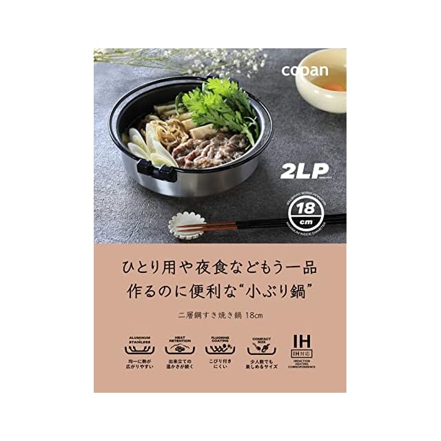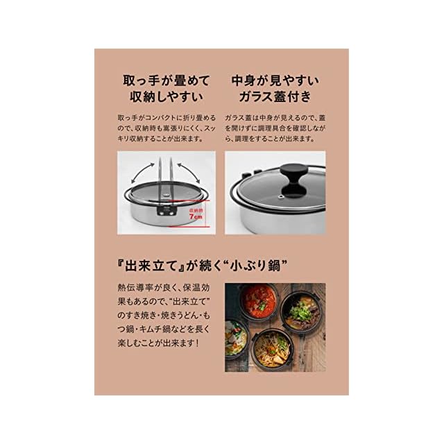 熱伝導率が良く、保温効果もあるので、“出来立て”のすき焼き・焼きうどん・もつ鍋・キムチ鍋などを長く楽しめる小ぶり鍋。
