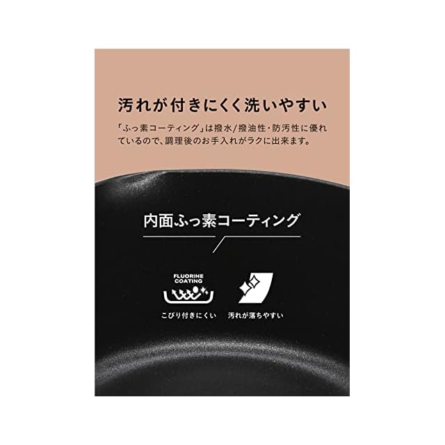汚れが付きにくく洗いやすい「内面ふっ素コーティング」撥水/撥油性・防汚性に優れているので、調理後のお手入れがラクに出来ます。