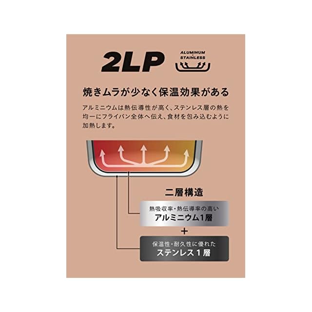 焼きムラが少なく保温効果があるアルミニウムとステンレスの2層構造。アルミニウムは熱伝導性が高く、ステンレス層の熱を均一にフライパン全体へ伝え、食材を包み込むように加熱します。