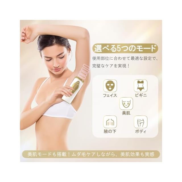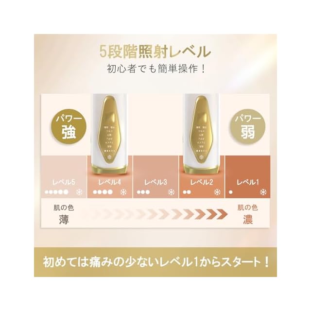 【5種類モード&5段階照射レベル】5種類のモード(美 肌、フェイス、ボディ、腋の下、ビギニ)と5段階の照射レベルを搭載し、使用部位や肌質に合わせて最適な設定が選べます。照射レベルは1〜5段階で調節可能。説明書のカラーチャートを参照に、ご自身の肌色と毛の色に合う照射レベルで使うのはより快適な脱毛体験を楽しめます。初心者でも安心して簡単に使えます。