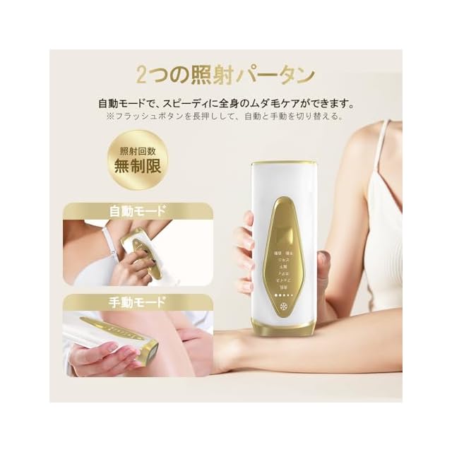 【自動照射/手動照射】2つの照射モードで、ムダ毛ケアがさらに効率的に!広範囲な部位(腕、足、背中)には自動照射モードを、狭い部位(指、脇、VIOゾーン)には手動照射モードを使い分けることで、部位ごとに最適なケアが可能です。操作は簡単で、誰でも手軽に使える。全身をこれ1台でケアでき、効果的かつ効率的にムダ毛を処理できます。