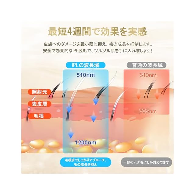 【サロン級IPL光技術&低温サファイア冷却】IPL光技術(波長510-1200nm)を搭載し、肌に優しく作用して、刺激を抑えつつ、毛根に効果的にアプローチ。時間や費用を節約しながら、自宅で簡単にプロフェッショナルな脱毛ケアを!さらに、低温サファイア冷却技術を組み合わせることで、照射時の熱感や痛みを大幅に軽減し、肌を冷却しながら照射するため、快適にムダ毛ケアができます。