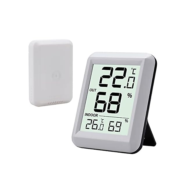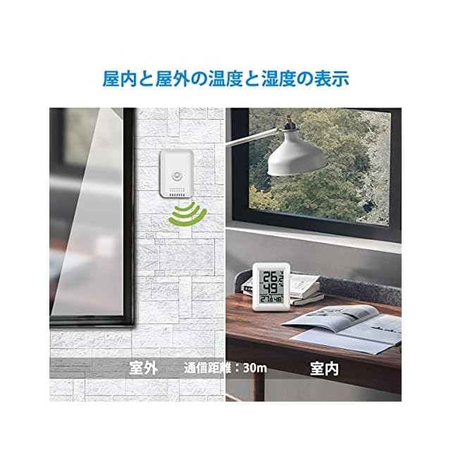 【室内・室外兼用】:室内でも両方の温湿度がチェックできる便利な計器です。子機センサーから親機に測定結果を送信できる距離は見通しの良いところで約30mです。 子機センサー利用して、2ヵ所の測定値は自動的に親機に送信します。エアコンを使うときにはとても役に立ちます。