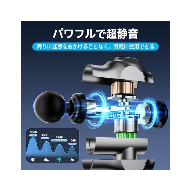 【交換可能なアタッチメント4つ&低騒音】VTT 筋膜リリースガンはノイズを低く抑えるため、最先端18Wハイトルク静音モーターサットを採用し、最大3000rpm/minでの作動音も45dB(日常会話の程度)以下に抑えられて非常に低騒音で、時間や場所に気にする必要はなく、周りの迷惑になる心配もなし、ジムやオフィス、いつでもどこでも楽しむことができます。