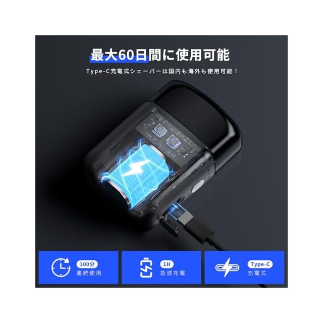 【125g超軽量&Type-C急速充電】わずか125gの軽量設計で、ビジネスバッグに入れて出張や旅にも持ち運べます。Type-C充電式シェーバーは国内も海外も使用可能、車載充電器やモバイルバッテリーからも手軽に充電でき、1回のフル充電で約最大60日間使用でます。旅行モード機能を搭載し、バッグの中での誤操作を防止します(3秒長押しで自動ロック)。
