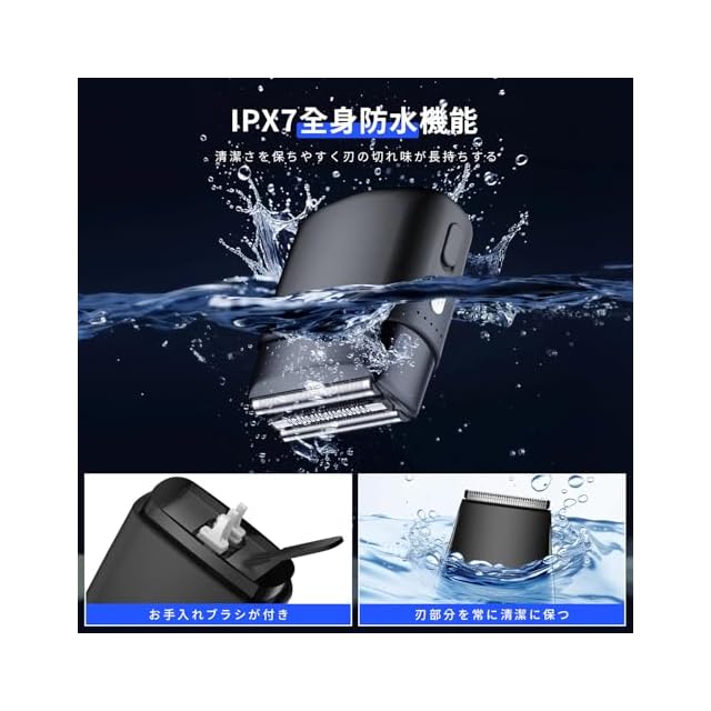 【IPX7全身防水設計&乾湿両用】IPX7基準の100%防水設計でシャワー中でも使用可能で、ドライシェービングにもウェットシェービングにも対応します。お手入れ用ブラシが付属しているうえに丸ごと水洗い可能で、シェーバー メンズ のヘッド内部に溜まる髭くずを払い落としてから水で洗い流せるため、清潔に保ちやすく刃の切れ味が長持ちします。c