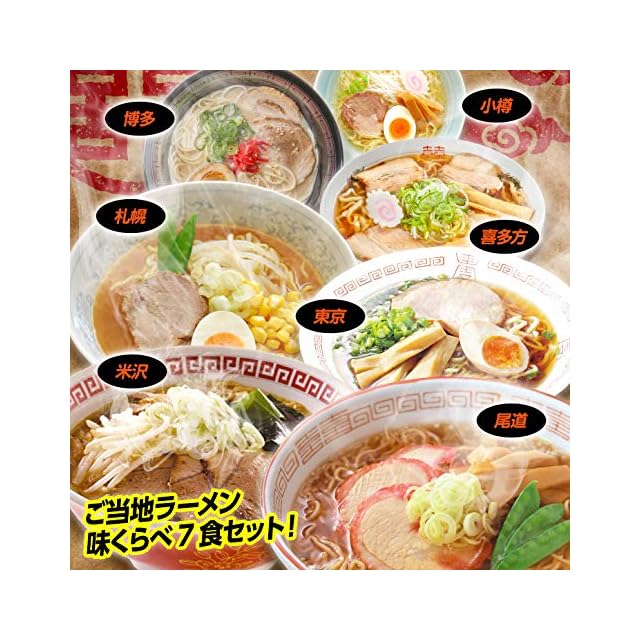 北は北海道、南は九州まで全国7か所のラーメンをご自宅で楽しめるラーメンセット。小樽塩味、札幌味噌味、喜多方醤油味、米沢醤油味、東京醤油味、尾道醤油味、博多とんこつ味が各1食入り。ご家族にも大人気の商品です。