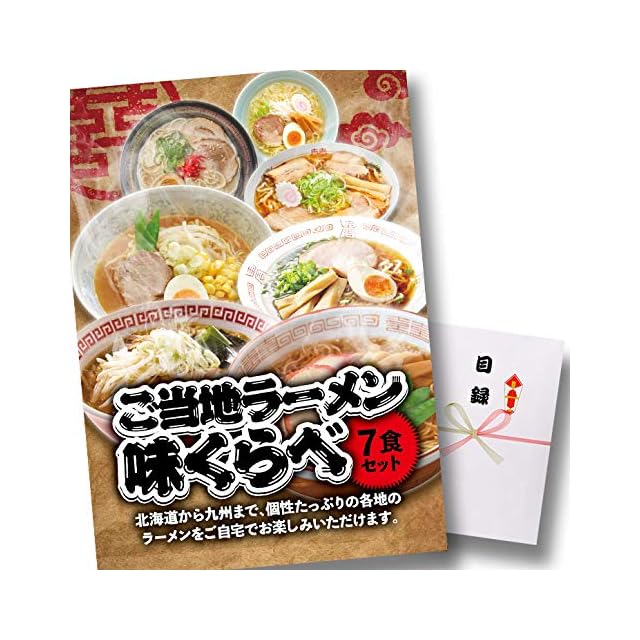 パネル付き目録 ご当地ラーメン味くらべ7食セットの解説<br> 北は北海道、南は九州まで全国7か所のラーメンをご自宅で楽しめるラーメンセット。<br> 小樽塩味、札幌味噌味、喜多方醤油味、米沢醤油味、東京醤油味、尾道醤油味、博多とんこつ味が各1食入り。<br> ご家族にも大人気の商品です。 <br> パネル付の目録はゴルフコンペの景品・賞品、結婚式の二次会、忘年会、新年会、ビンゴ、イベント、宴会の景品で盛り上がります。<br> 幹事さんも貰った方もかさばらず、好きな時に注文、お取り寄せできるのも人気のポイントです。<br> ブランド パネル付き目録<br> サイズ パネルサイズ:A4(297mm×211mm)<br> その他 パネルのデザインは予告無く変更になることがございます。<br> 商品分類 パネル、目録、ギフト、お取り寄せ、ラーメン<br> ■商品お受け取りまでの流れ<br> 1ご注文者様へパネルと目録をお送りいたします。<br> 2目録を受け取った方が、引換券(申込みハガキ)に必要事項をご記入頂き、ポストへ投函していただきます。<br> 3ポスト投函後、約10日ほどで商品をお届けいたします。<br>