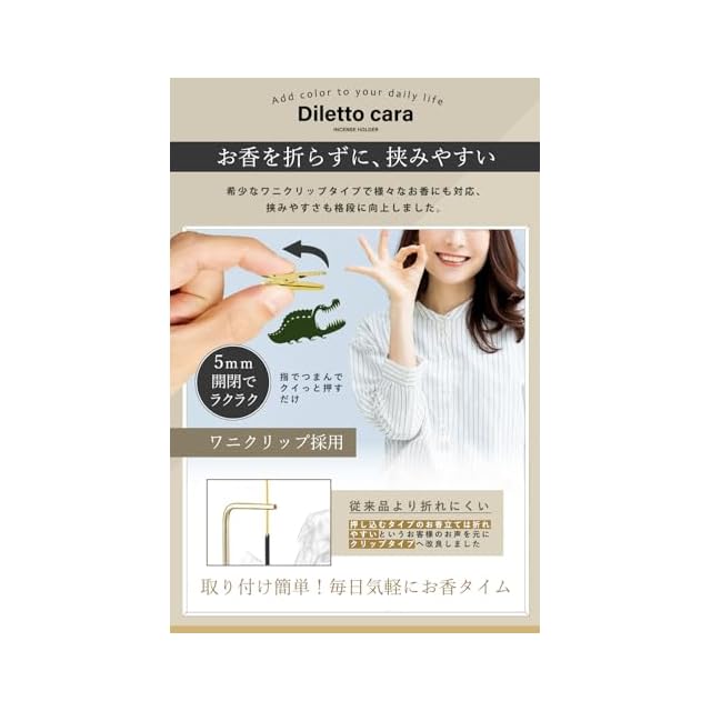 【ワニクリップでどんな線香もズレずに固定】:市販の大径線香から竹芯香まで幅広く対応。折れにくいクリップで手軽にセットできるから、初心者でもストレスフリー。