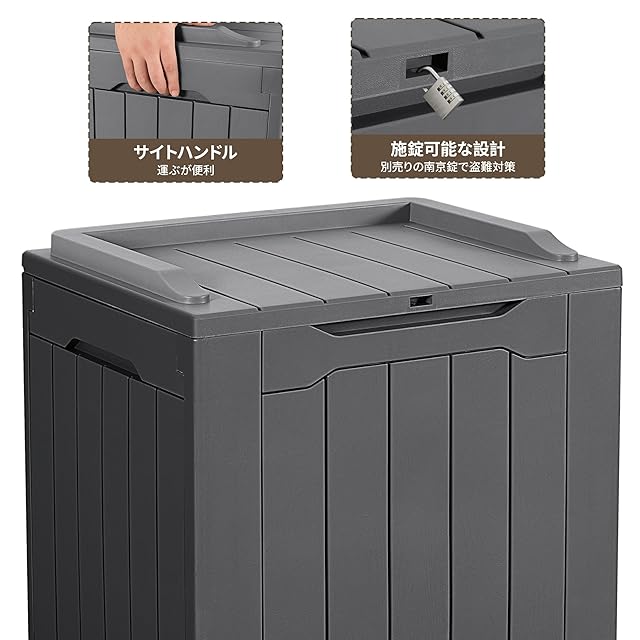 「お洒落な木目調デザイン」:収納箱の表面は天然の木に近い木目模様のデザインが施されています。お洒落なデザインでありながら、箱からは自然な温もりが感じられます。このお洒落は、室内にも、お庭や屋外にも馴染みやすく、置くだけでお洒落な印象を演出します。