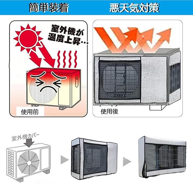 【簡単装着・取り外し不要】被せるだけなので簡単に室外機を守ってくれて安心です。設置し易く、取り外しも簡単です。エアコン室外機 日よけ 下部に固定用紐があって縛ることによって取付固定されます。組み立ての手間もなく、簡単に設置することができます。起動後の通常の使用,取り外し不要。また使用しない時にはコンパクトに収納でき、劣化して処分する際も便利です。