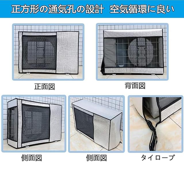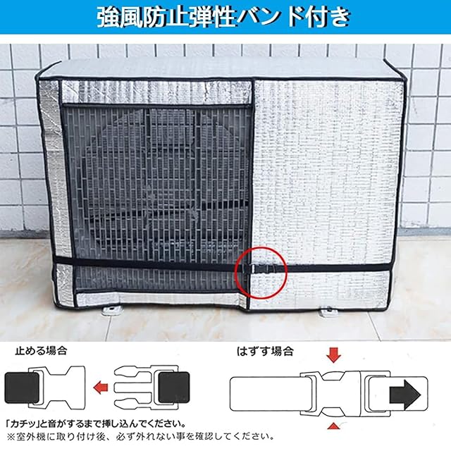 【固定用ベルト付き・オールシーズン適用】本室外機遮熱カバーは撥水加工生地を採用しているので、雨水を撥ね付け、泥やホコリなどがこびりつくのを防止できます。耐候性に優れているので、四季通用の素敵製品です。夏場や台風や、梅雨などの雨の季節には飛散した泥水や葉が室外機中に入り込むのを防ぎます。縛っておけば台風でも飛んで行かないし、寒冷地で積雪にも耐えて破損もしてないので堅牢性が高いです。エアコン必要がない季節はカバーも取り外し不要でとても便利です。 (ご注意事 項:室外機側面などの「通風孔」をふさがずにご利用ください。)