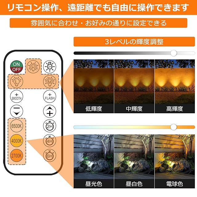 【3色切り替え&2H/4H/6Hタイミング機能】3種類色温度自由に調整可能、電球色のもとに、昼白色と昼光色の2種類色温度が追加されました。当社のソーラーライトには3段階の明るさ(100%-70%-50%)調節可能です。実際の使用環境において、一晩中はしっかり点灯出来ます。また、タイミング機能付き(2H,4H,6H常時点灯設定可能),ライトが2H/4H/6H点灯した ら自動的に消灯します。長時間照明が可能です。