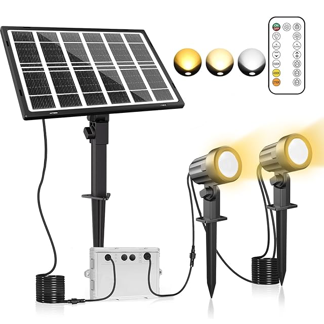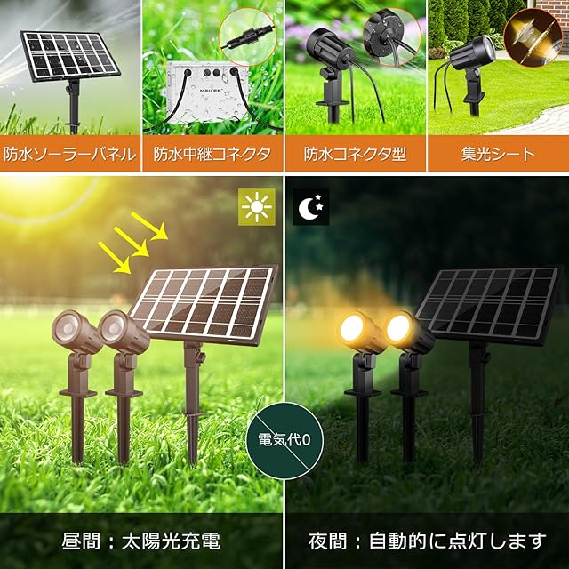 MEIKEE 改良版ソーラー ガーデンライト ソーラーライト 屋外 【リモコン付き】スポットライト電球色 昼白色 昼光色 3色切替 3段階調光 IP66防水 3000mAH 200LM*2 明暗センサー 自動点灯/消灯 連続点灯12時間可能 タイミング機能 2H/4H/6H常時点灯可能 メモリー機能 電気代0 庭園照明 防犯対策 玄関先 庭 車道 芝生 1年間 適格請求書発行可能 | つむぎ屋