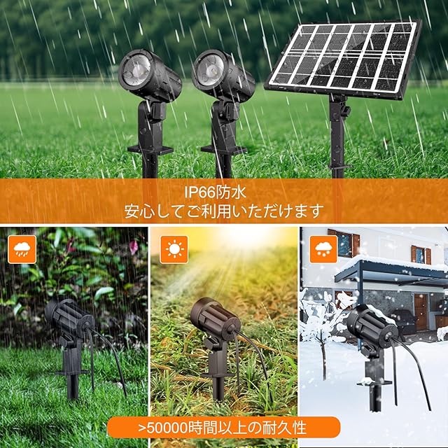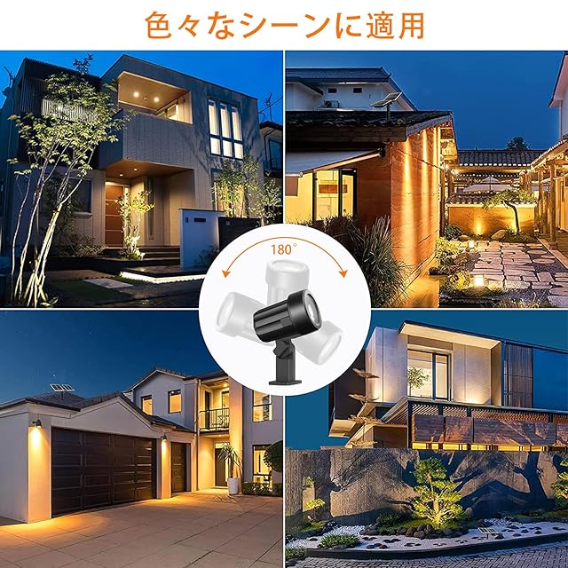 【可変的取り付け方法&防犯照明】地面に挿し込むほか、壁などに固定することができ、2wayでお使いいただけます。プラグは付いているので木陰の下でも使用出来ます。安定性があります。延長コートを接続けることが出来ます。ライトヘッドは上下最大180°まで調節でき、個々の位置合わせが可能です。ソーラーライトの本体は黒いプラスチックと透明なガラスでできています。パティオ、庭、玄関、芝生、通路、階段、車道などの屋外の照明やセキュリティに最適。